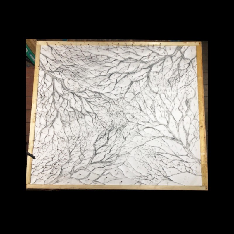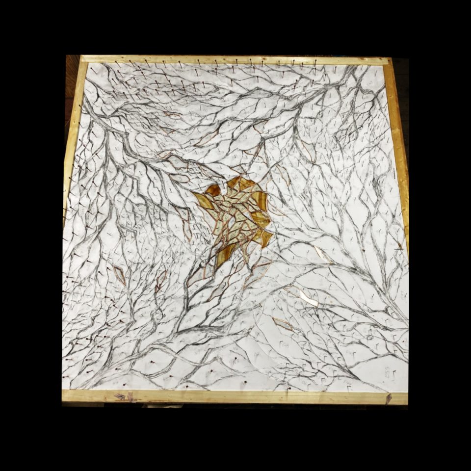 The laylight is five feet by five feet. One of the challenges we face is how to support it’s weight while horizontal. Part of the solution is to insert overlapping finishing nails in the spaces for the branches before we fill them with solder. On the larger branches, we will solder 1/8 x 3/8 inch reinforcing bars in the spaces.