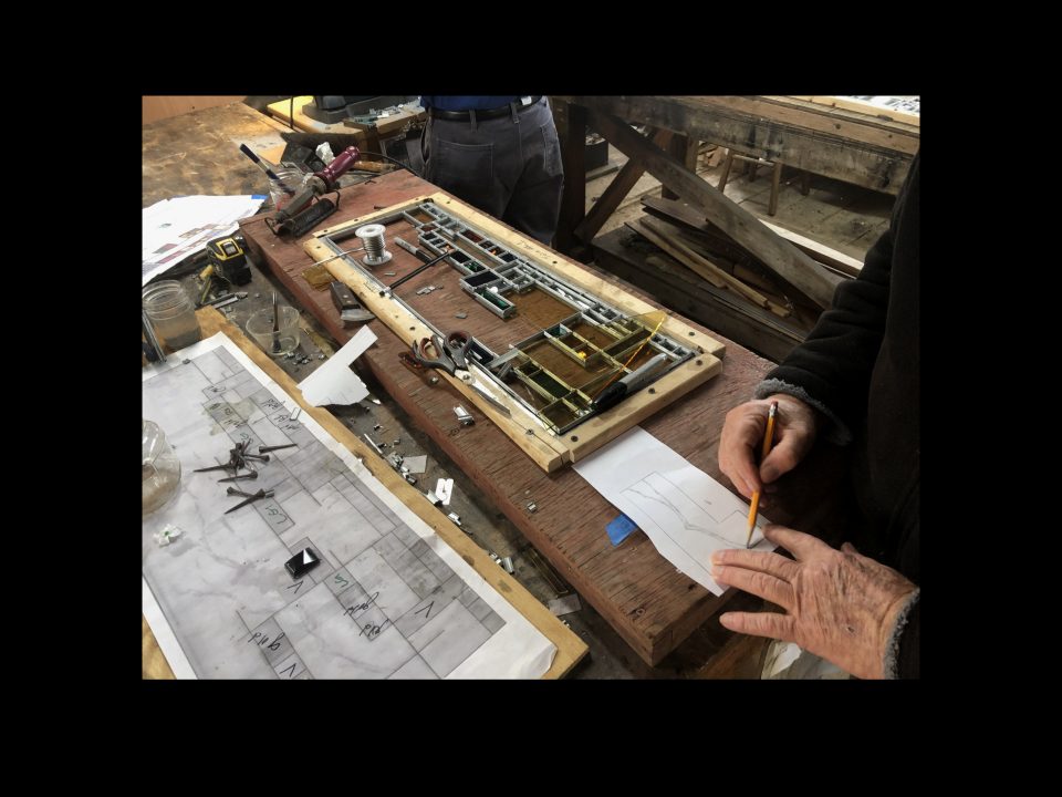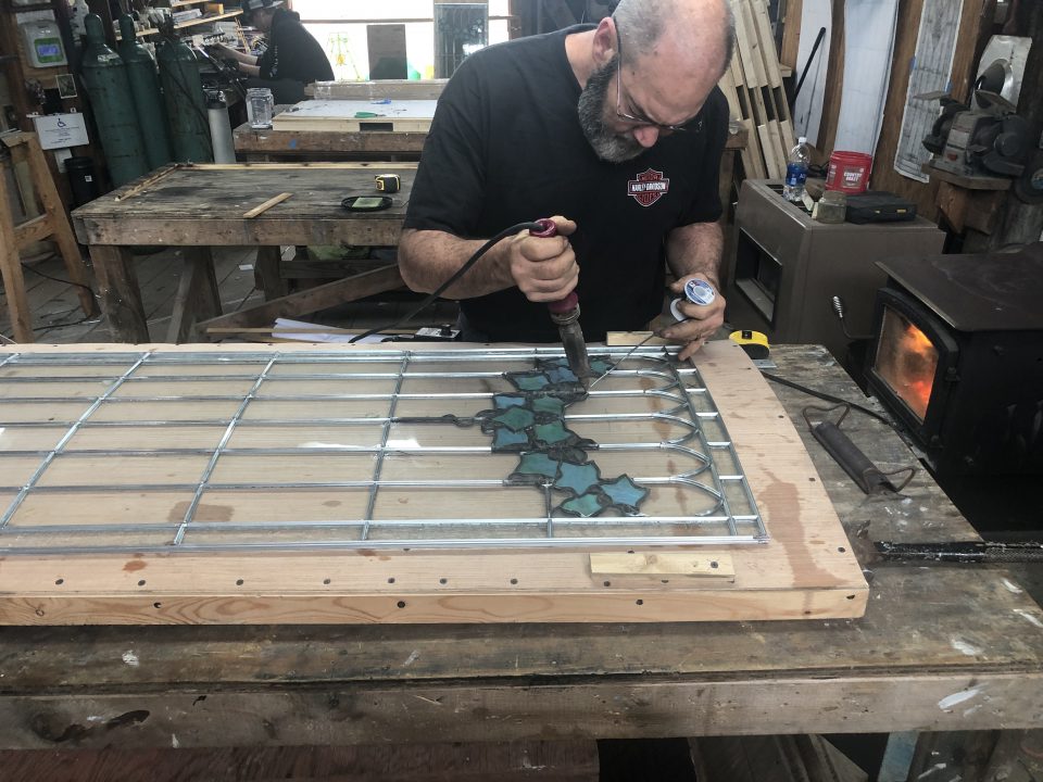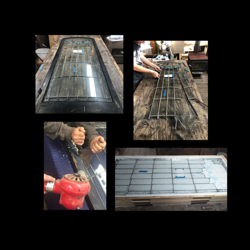This is a progress shot of two sidelights we beveled around 30 years ago. After the final inspection, and before we begin to zinc them together.