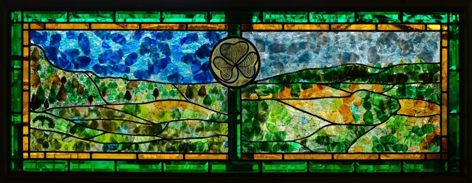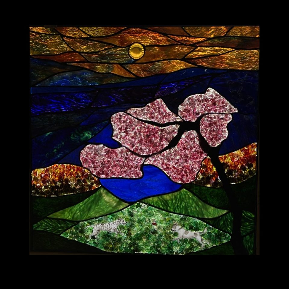 A recently completed commission in which I combined traditional stained glass techniques with our “Painting with Glass” to create a dramatic depiction of a fading sunset, casting shadows through the mountains while highlighting the translucency of nature in the foreground.