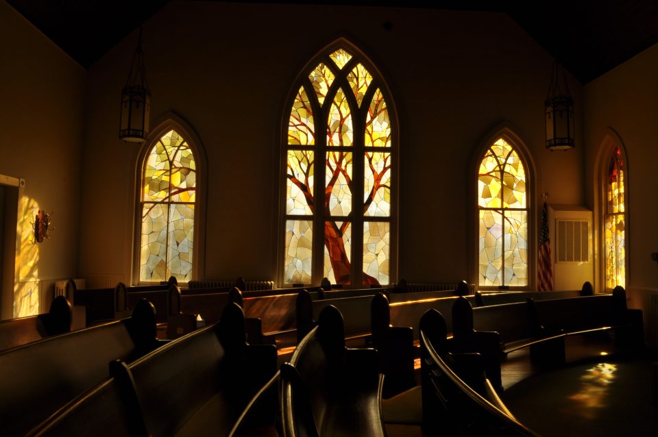 Two members of the church approached me about working with them to create windows for their sanctuary. “We know we don’t want traditional windows, but we also don’t know what we want.” I visited Amelia and found their church nestled in a grove of old oak trees. Many in the congregation were in the logging business.