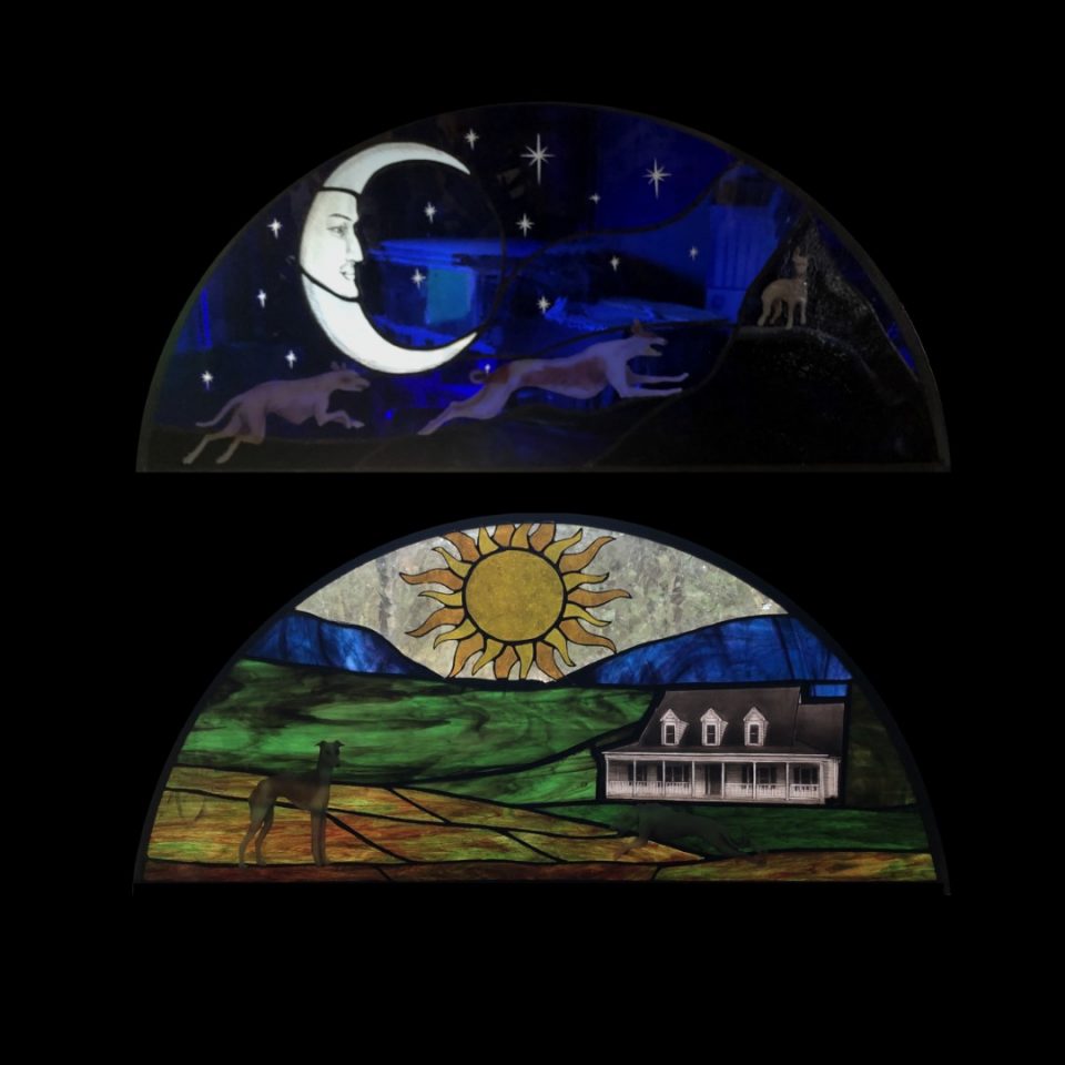 Two windows we just completed for a couple who wanted to feature their whippits, greyhounds, home, and their beautiful setting between mountain ranges.