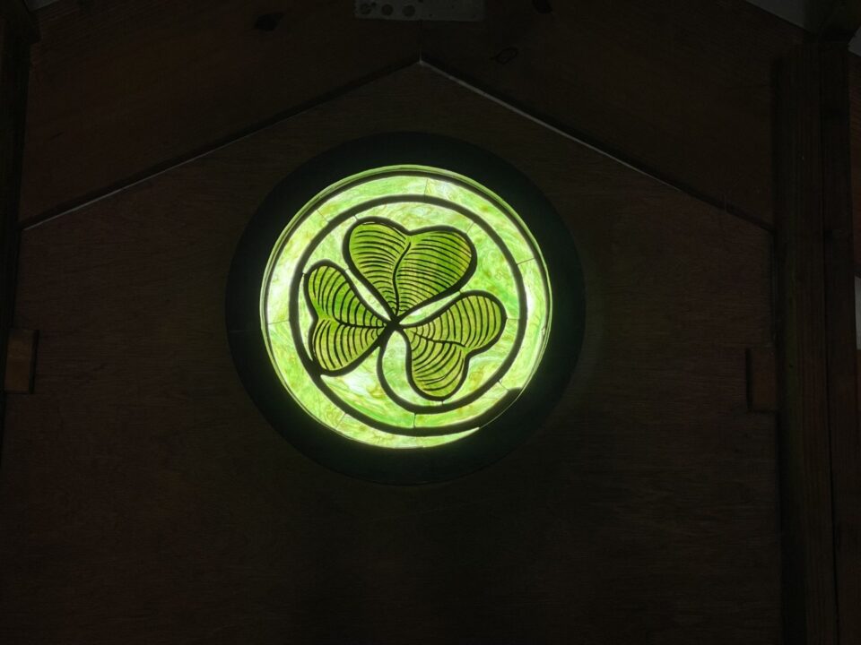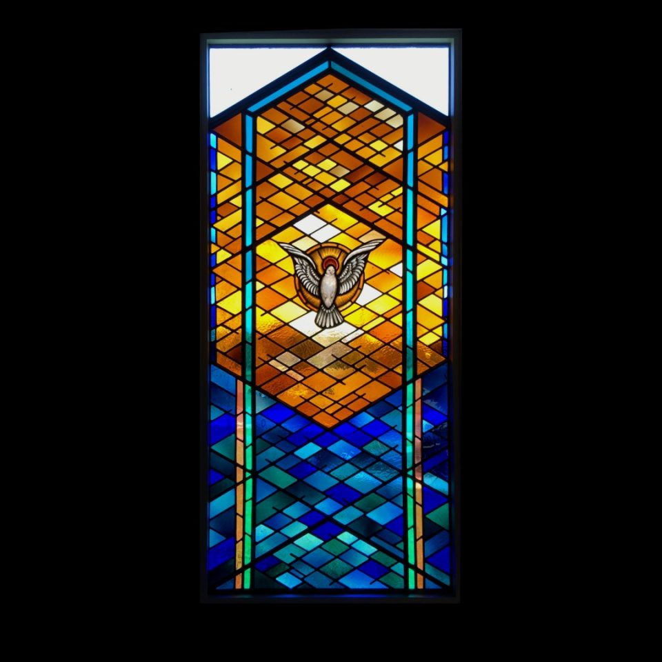 Glue chipping glass for the background, beveling various thicknesses and angles, and with a multitude of tiny lights on the chandelier behind it, shimmering on the bevels as one walks around the sanctuary. It has often been referred to as our “spiritual window.”