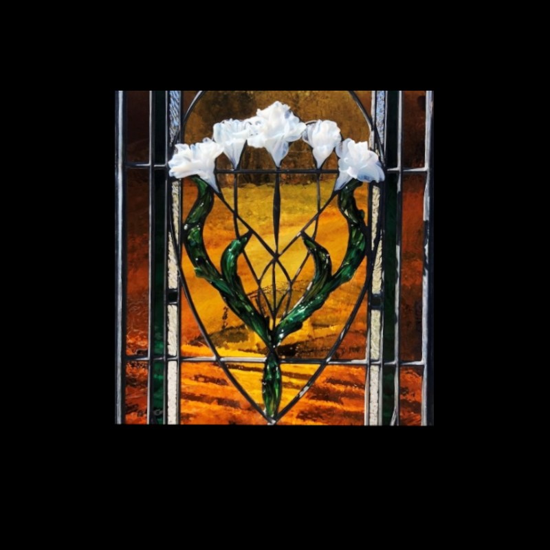 By beveling the background glass, a 1/8″ flash glass from Germany – gold on clear, I wanted to emphasize the light surrounding the floral image – halation.